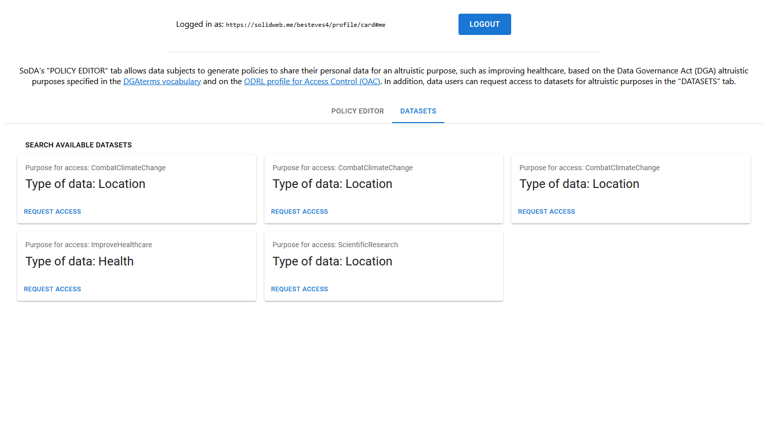 An example is shown below of a catalog of datasets maintained by SoDACompany, a fictional data altruism organisation.